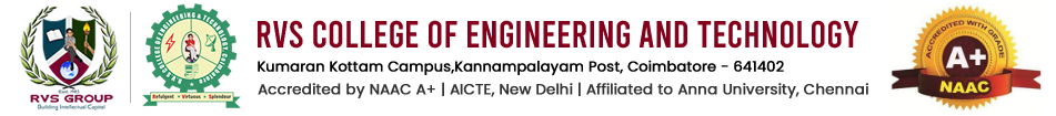 RVSCET approved by AICTE and affiliated to the Anna University, Chennai is marching towards a new era in education was established in the year 2007 by our Chairman Dr. K. V. KUPUSAMY and the college has attained the role of "Holistic Education" right from the start. The college is located 14 kms away from the cotton city of Tamilnadu, Coimbatore, spread over a sprawling campus area of 200acres bordered by the serene beauty of Southern India. RVS is well connected by buses moving to various places in propinquity. RVS is attaining eminence as the favorite target for Engineering Education, for its immaculate infrastructure, outfitted with the best of facilities over a rambling campus area. The various courses offered are B.E. (CSE, ECE, EEE and MECH, MECHNICAL & AUTOMATION), B.Tech (AI&DS, IT, BMI and PCT), M.E(EST), M.E (CS), M.E (AE), M.E (CE), M.E (ISE), M.E (CSE), M.E-AI&MC, M.E (TE), MCA.